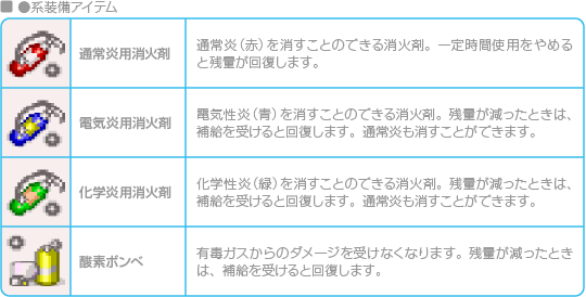 主人公のいる画面の消火をします。延焼率が大きいときに使用すると有効です。また、消防車の配置場所によって効果が変化します。 |