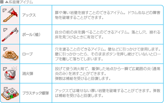 アイテムは装備して使用する「装備アイテム」、各ミッション(炭坑を除く)で3回ずつ使用できる「サブウエポンアイテム」、ミッションクリア時にイベントが発生する「イベントアイテム」、いらないアイテムを捨てるときに使う「ごみ箱アイテム」の4種類が存在します。 |