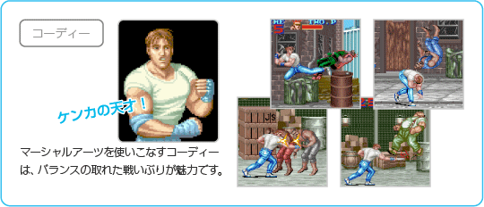 『ファイナルファイト』最大の魅力は、2人の主人公「コーディー」と「ハガー」がくり出す数々のアクション。 2つのボタンと ![]() ![]() |