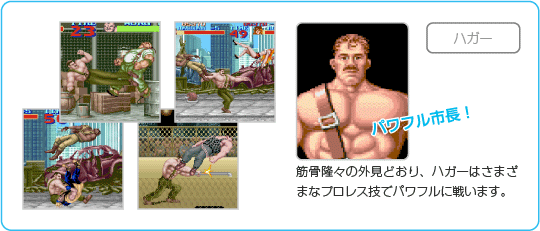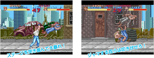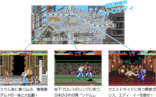 スラム街から巨大企業のビル内まで、広大な「メトロシティ」のすべてが戦いの舞台。 市内の各エリアでは、敵の組織「マッドギア」のさまざまなキャラクターが待ち受けています。 ボスたちはもちろん、ザコ敵にまでプロフィールが用意されるなど、その作り込みはファンを飽きさせません。 ![]() |