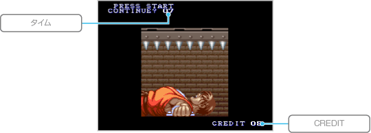 ゲームオーバーになったときにCREDITが残っている場合は、コンティニュー画面が表示されます。タイムが00になる前に