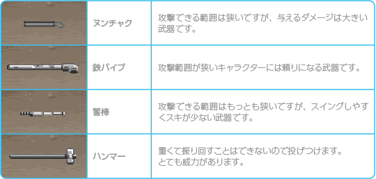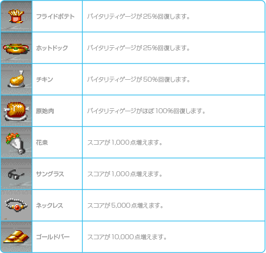 ラウンド中に登場するアイテムは、持って攻撃ができる「武器」と、バイタリティゲージの回復やスコアが獲得できる「ボーナスアイテム」の2種類があります。