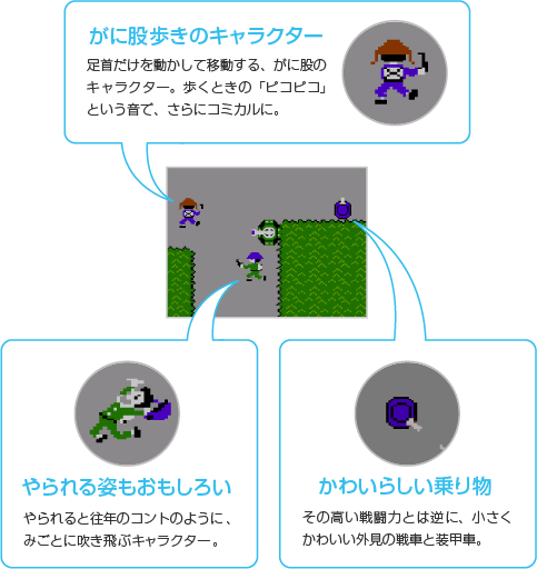 戦場といえば殺伐とした雰囲気を想像しますが、本作は少し違います。あらゆる方向から攻撃してくる敵との激しい戦いのなか、どこかおもしろくかわいらしいキャラクターたちが心をなごませてくれます。 |