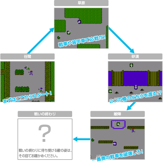 戦場は4つのフィールドで構成されています。左右の山からも敵が攻めてくる「谷間」、戦車や装甲車が攻めてくる「草原」、地面の不発弾が邪魔をする「砂漠」、一番奥に戦車が待ち受ける「敵陣」。いずれもバラエティ豊かで、奥に進むほど敵の攻撃が激しくなったり、地形に邪魔されて進みにくくなります。はたして、これらを突破した先に待ち受ける敵の姿とは……!? |