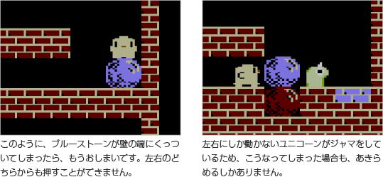 | ステージ内にあるブラウンストーンはとても重要です。ただし、ブラウンストーンは壁や床、起きている敵や別のストーンに押しつけると、カンタンに壊れてなくなってしまいます。ブラウンストーンの数が足りないとクリアできなくなってしまうステージも多いので、扱いには十分気をつけましょう。 | ![]() |
