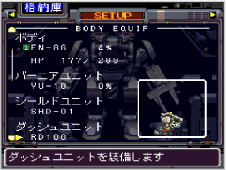 | ヴァンツァーは2種類の武器のほか、「バーニアユニット」「シールドユニット」「ダッシュユニット」を装備することができます。これらをミッションに合わせ、自由に組み合わせて出撃することで、さまざまな戦いかたができるでしょう。 また、ヴァンツァー自体も、ゲームが進むとより高性能の機体が登場し、乗り換えていくことができます。 |