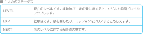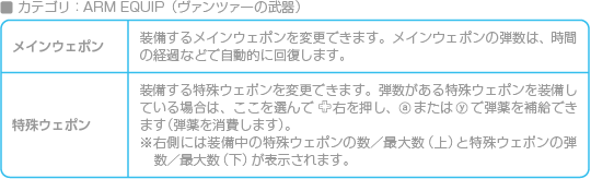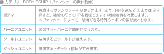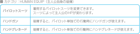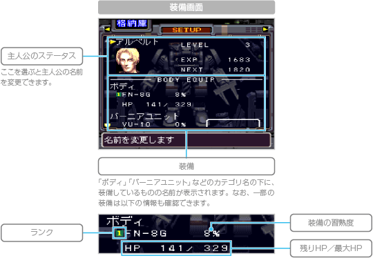 装備画面が表示され、主人公やヴァンツァーの確認と装備変更ができます。 ![]() ![]() ![]() ![]() ![]() ![]() |