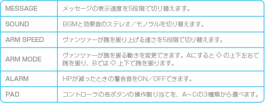ゲーム中のさまざまな設定が行えます。 |