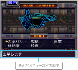 マップ画面からステージに入ると、艦内メニューが表示されます。 準備ができたら「カタパルト」から「発進」を選んでステージ画面に出撃しましょう。 |