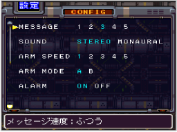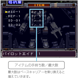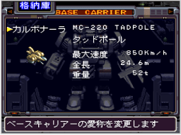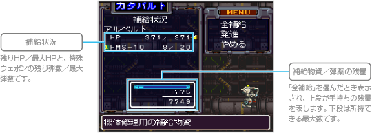 「全補給」を選ぶと自動的にヴァンツァーのHPが回復し、特殊ウェポンの弾薬が補給されます(補給物資や弾薬を消費します)。「発進」を選ぶとステージ画面に出撃し、ミッションが始まります。 ![]() |