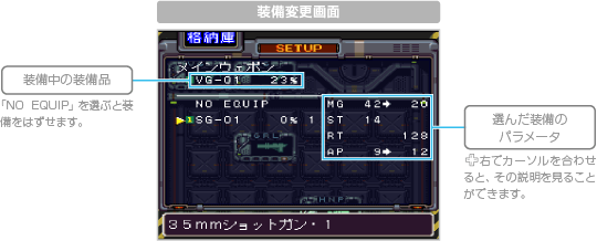 主人公やヴァンツァーの状態を確認したり、出撃時の装備などを変更することができます。 |