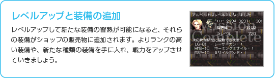 一定の経験値を得てレベルアップすると、操縦するヴァンツァーと主人公自身のHPが増えます。ミッション後のリザルト画面で確認しましょう。 また、「習熟不可」だった高ランクの装備が習熟可能になることもあります。 |