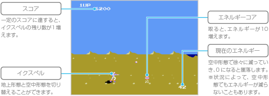 敵や敵の弾に当たったり、墜落するとミスとなり、イクスペルの残り数が1減ります。残り数が1のときにミスをすると、ゲームオーバーになってタイトル画面にもどります。