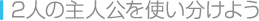 男の子ではできないことを女の子ができたり、逆に女の子ができないことを男の子ができる場合があります。お話が進まなくなったら、コマンド「ひとかえる」で2人を使い分け、さまざまなコマンドを試してみましょう。 また、2人はそれぞれ別々にアイテムを持つことになります。2人でさまざまなアイテムを使い、お話を進めていきましょう。 |