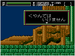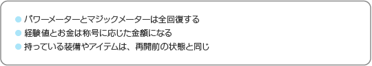| 敵の攻撃を受けるとパワーメーターが減っていき、0になるとゲームオーバーです。ゲームオーバーになると最後に祈りのことばを聞いた教会から再開します。このとき、主人公の状態は以下のようになります。 | ![]() |