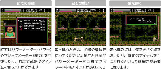 町の人々から集めた情報をもとに探索し、魔界丘を目指してください。そのためには町で準備を整え、武器や魔法で敵を倒し、先へ進むための手段を見つける必要があります。 ![]() |