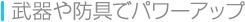 主人公は、強力な武器や防具を装備することで強くなっていきます。値段の高いものほど強力なので、移動中は積極的に敵を倒してお金を貯めておくことが大切です。 |