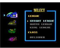 出場したいリーグ(LEAGUE)を決定すると、カーソルがクラス(CLASS)に移ります。 なお、リーグは「KNIGHT」「QUEEN」「KING」の順、クラスは「BEGINNER」「STANDARD」「EXPERT」の順に難しくなります。 |