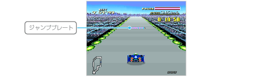 コース上のジャンププレートを通過するとジャンプでき、うまくジャンプすれば加速したり、コースをショートカットすることもできます。 また、着地時に ただし、ジャンプしてコースの外に落ちるとリタイアとなります。また、極端なショートカットは反則と判定され、一定の距離をもどされてしまうこともあるので注意しましょう。 |