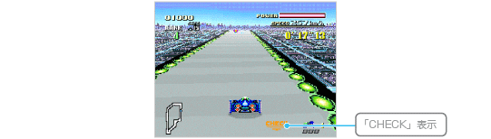 レース中、後ろからほかのマシンが迫ってくると、「CHECK」の表示が表 れます。抜かれないように、うまくコース取りをしましょう。 |