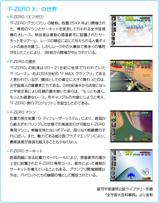 | 1990年にスーパーファミコン用ソフトとして発売され、その圧倒的なスピード感で人気を博した『F-ZERO』が、ニンテンドウ64用ソフト『F-ZERO X』として復活。1998年7月14日に発売された本作は、音速を超えるスピードをリアルに体感でき、マシンやサーキットの数も大幅にパワーアップしています。白熱必至のレース展開がプレイヤーを魅了します。 | ![]() |