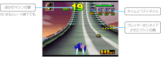 ほかのマシンをすべてリタイアさせるまでのタイムを競います。体当たりやサイドアタック、スピンアタックなどを駆使してほかのマシンをリタイアさせてください。なお、周回数に制限はなく、1周目からブースターが使用できます。