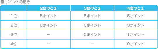 レースが終了すると、順位に応じてポイントが与えられます。ポイントの配分は、レースを行うマシンの台数によって異なります。