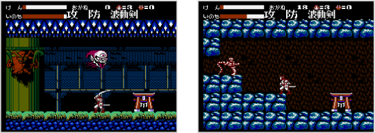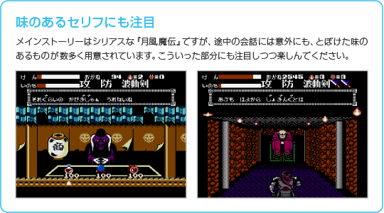 『月風魔伝』は1987年7月7日にファミリーコンピュータで発売されたアクションRPGで、2人の兄を殺された主人公「月風魔」の、復讐の旅を描きます。おどろおどろしい雰囲気の地獄を舞台に、「鬼面般若」や「狂赤鬼」など、和風テイストの魔物たちが数多く登場します。 ![]() |