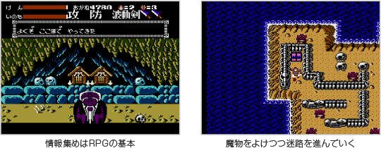 宿敵である魔王・龍骨鬼を倒すためには、フィールド上を旅してさまざまな場所を訪れ、アイテムを集める必要があります。また、あちこちにある「ほこら」では、さまざまな情報を得ることができます。 さらにフィールド上には、魔物たちが守りを固める迷路などもあり、プレイヤーを飽きさせません。 ![]() |