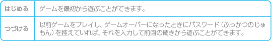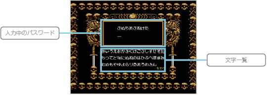 タイトル画面で「つづける」を選んだ場合は、パスワード入力画面に進みます。 16文字すべてを入力したあと ![]() |