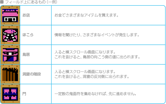 鳥居や階段などに入ったり、魔物とぶつかると、横スクロール画面に進みます。 ※一部の階段に入ると、3D画面に進みます。
