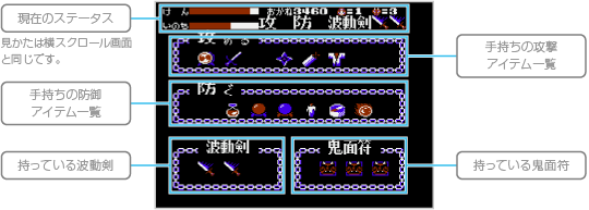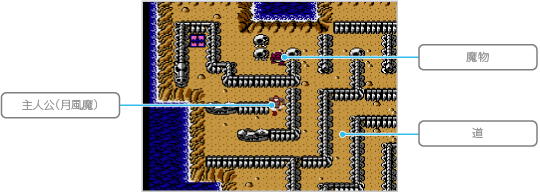 主人公「月風魔」となって、奪われた3本の「波動剣」を取り戻し、狂鬼島に棲む龍骨鬼を倒すことがゲームの目的です。波動剣は鬼顔島、獄門島、三首島の3つに隠され、それぞれの島に渡るためには通行手形「鬼面符」が必要になります。 フィールドを旅してさまざまな情報やアイテムを手に入れ、ゲームを進めてください。 |