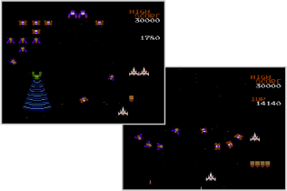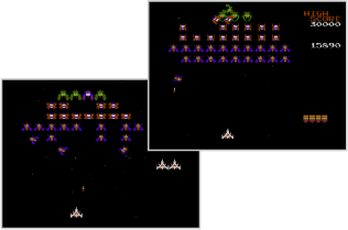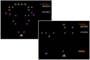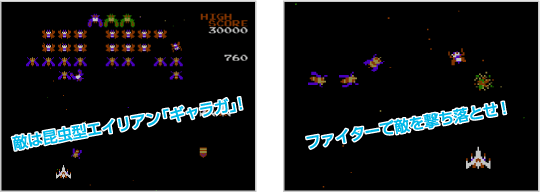 一見、予想もつかない動きで迫るギャラガたち。動きのパターンを見きわめて撃墜しよう。 |