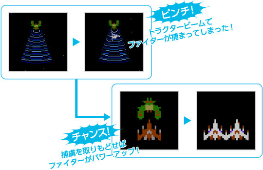 敵のリーダーであるボスギャラガが発射するトラクタービーム。 これに当たると、ファイターが敵の捕虜になってしまいます。 しかし、このボスを撃ち落として捕虜を取りもどすと、強力なデュアルファイターにパワーアップ! 2倍の火力で一気にギャラガたちを打ち負かしましょう。 |
