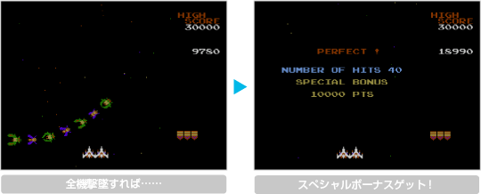 数ステージおきに登場するチャレンジステージは高得点獲得のチャンス! ギャラガたちが攻撃してこないこのステージでは、思う存分にねらい撃ちを楽しむことができるのです。 チャレンジステージしか登場しないギャラガもあり、プレイヤーを飽きさせません。 |
