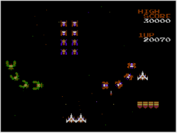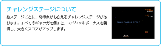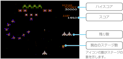 敵を倒すとスコアが増え、攻撃中の相手や編隊を組んだボスを倒すと、もらえるスコアがアップします。 一定のスコアに達すると、ファイターの残り数が増えます。 |