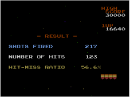 「敵に当たる」「敵の攻撃を受ける」とミスになって残り数が減ります。残り数がないときにミスしたり、ファイターが捕虜になるとゲームオーバーです。 なお、ゲームオーバーになると右の画面が表示され、「SHOTS FIRED (撃ったミサイルの数)」「NUMBER OF HITS(命中した数)」「HIT-MISS RATIO(命中率)」を確認できます。 |