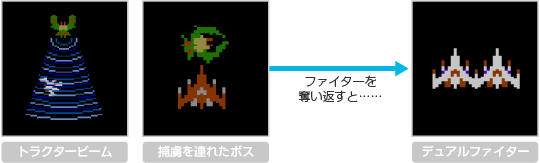 敵のボスが撃つトラクタービームに当たると、ファイターが捕虜になって残り数が減ります。しかし、ファイターを捕虜にしたボスを飛行中に倒すと、ファイターを奪い返して、強力なデュアルファイターに変化します。うまく戦いに活かしましょう。 なお、デュアルファイター状態でミスすると、ファイターが通常のファイターにもどります。 ※ボスは攻撃を2回当てると撃破できます。 |