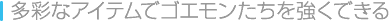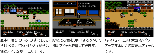 補助アイテムを手に入れることで、ゴエモンたちを強化できます。道中にあるお店では「讃岐うどん」や「ういろう」など、各地の名物が味わえます。 ![]() |