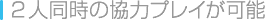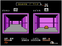 ゴエモンとえびす丸をそれぞれ操作し、2人で協力しながらゲームをプレイできます。アイテムが隠されている迷路では、1人ひとり画面が用意され、2人で別の道を進むことで効率よくアイテムを集めることができます。 |