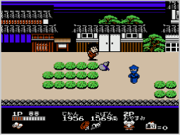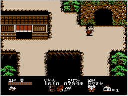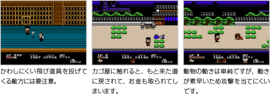道中では敵方がゴエモンたちの行く手を阻みます。長い刀で突いてくる、ちょうちんを投げてくるなど攻撃をしてくる敵方もいれば、ゴエモンたちをカゴに乗せ、お金を取るといったように邪魔をしてくる敵方もいます。 ![]() |