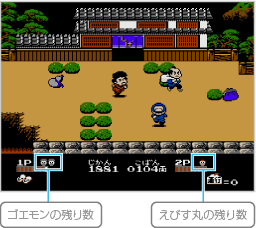 1Pはゴエモン、2Pはえびす丸を操作します。片方のプレイヤーの残り数が0になっても、残りのプレイヤーに残り数が2以上あれば、