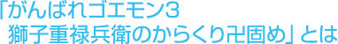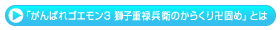 「がんばれゴエモン3 獅子重禄兵衛のからくり卍固め」は1994年12月16日にスーパーファミコン用のソフトとして発売されました。天下の義賊ゴエモンが、今度は3人の仲間とともに江戸から未来へタイムスリップ! 時代を越えた大冒険が繰り広げられます。 |