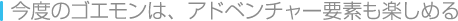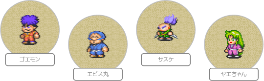 今回の冒険では、ゴエモンのほかにエビス丸、サスケ、ヤエちゃんを操作することができます。小判や爆弾、変身能力など、キャラクターによって攻撃方法や術はさまざま。なかには、特定のキャラクターの能力を使わなければ進めないところもあります。4人全員の能力をいかして、冒険を進めていってください。 ![]() |