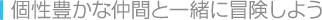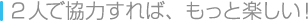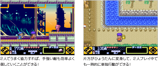 友だちとの2人プレイでは、力を合わせて敵を攻撃したり、しかけを突破したり、1人旅とはまた違ったおもしろさを味わうことができます。それぞれのお気に入りのキャラクターを使って、冒険を楽しんでください。また、今回は片方が「ひょうたん」に変身して、一時的に1人のプレイヤーに操作をおまかせすることも可能! 難しいステージや、1人でしか進めないステージなどで、上手に活用してください。 ![]() |