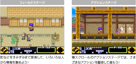 アクションゲームとして知られるゴエモンシリーズですが、この『ゴエモン3』では町を探索したり、情報を集めてストーリーを進めたりといった、アドベンチャー要素も大幅に追加されています。 もちろん、敵やしかけが満載のアクションステージも充実! ![]() |