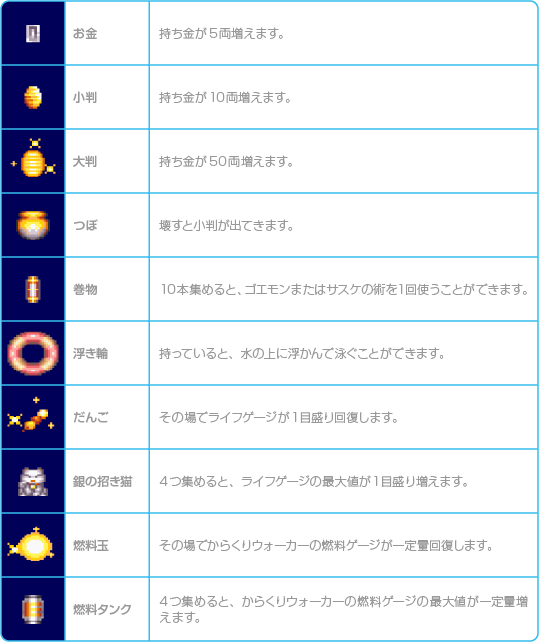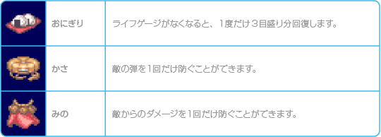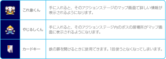 以下のアイテムはアクションステージ内で手に入れることができ、そのステージ内でのみ効果を発揮します。その他のステージでは使えないので注意してください。 ![]() |