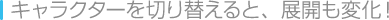 | フィールドステージでは、特定のキャラクターを操作していなければ通れなかったり、イベントが起こらない場所があります。 気になる場所があったら、 |