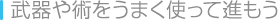 フィールドステージやアクションステージでは、特定の武器や術を使わないと、進むことができない場所があります。行き詰まってしまったら、キャラクターを切り替えて、さまざまなウエポンやサブウエポン、術を使ってみてください。 ![]() |