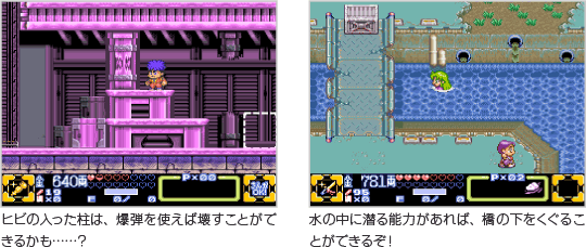 ライフゲージを回復する食べ物や身を守る防具など、旅に欠かせないアイテムを買うにはお金が必要です。また、小判や手裏剣などの便利なサブウエポンは、使うたびにお金を消費します。 敵を倒したらしっかり小判を取って、いざというときに金欠にならないように注意してください。 |